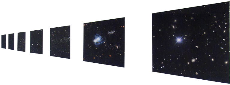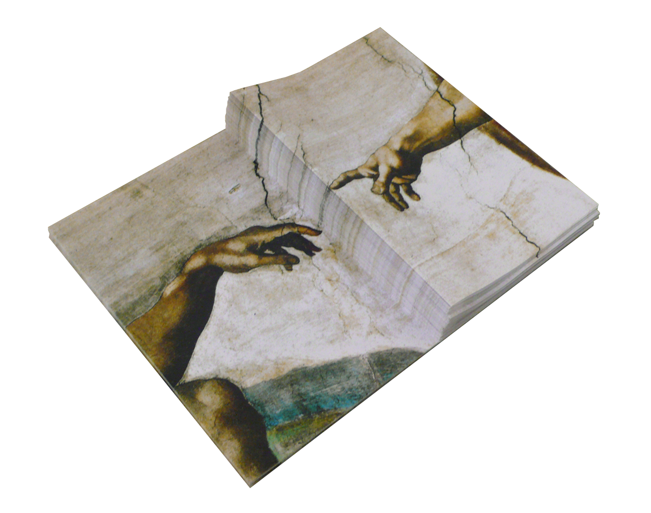 Tout comme l’introspection vécue par les protagonistes des road movies ne va pas sans la vacuité qui fait leur chemin, celle que vit Grégory Delauré dans son rapport aux images est un mélange d’épaisseur et de vide, du réel et de son double désirant. Ainsi All Mighty Photocopy : en empilant un certain nombre d’agrandissements du célèbre détail de Michel Ange, dont la moitié est pliée à l’endroit qui sépare encore l’index d’Adam de celui de Dieu, il accroît l’intervalle existant par deux hauteurs différentes et variables.
