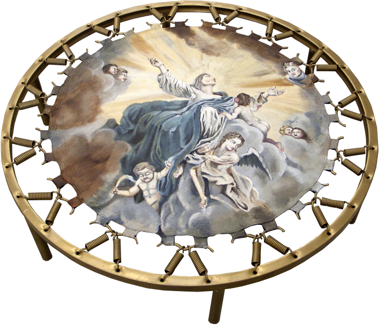 Un Christ en croix à faire voler comme un avion en papier, changer la carte postale de Jacobus Mayor en une embarcation pour son départ, aider la vierge à l’assomption par un trampoline doré… C’est extra, c’est extra. La mélodie du bonheur, un peu désuète et familière, de Grégory Delauré parmi les images.