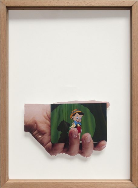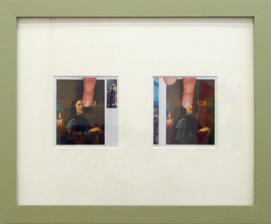 C’est une des facéties favorites de Grégory Delauré, que de semer comme un signe le geste de montrer. (…) Comme dans les tableaux dont il manipule les reproductions: pour la série Sans-titre (tangere), il les découpe à la jonction entre celui qui montre et ce qui est montré, l’absenté, l’ailleurs… ou la limite matérielle de l’image que l’on touche du doigt.